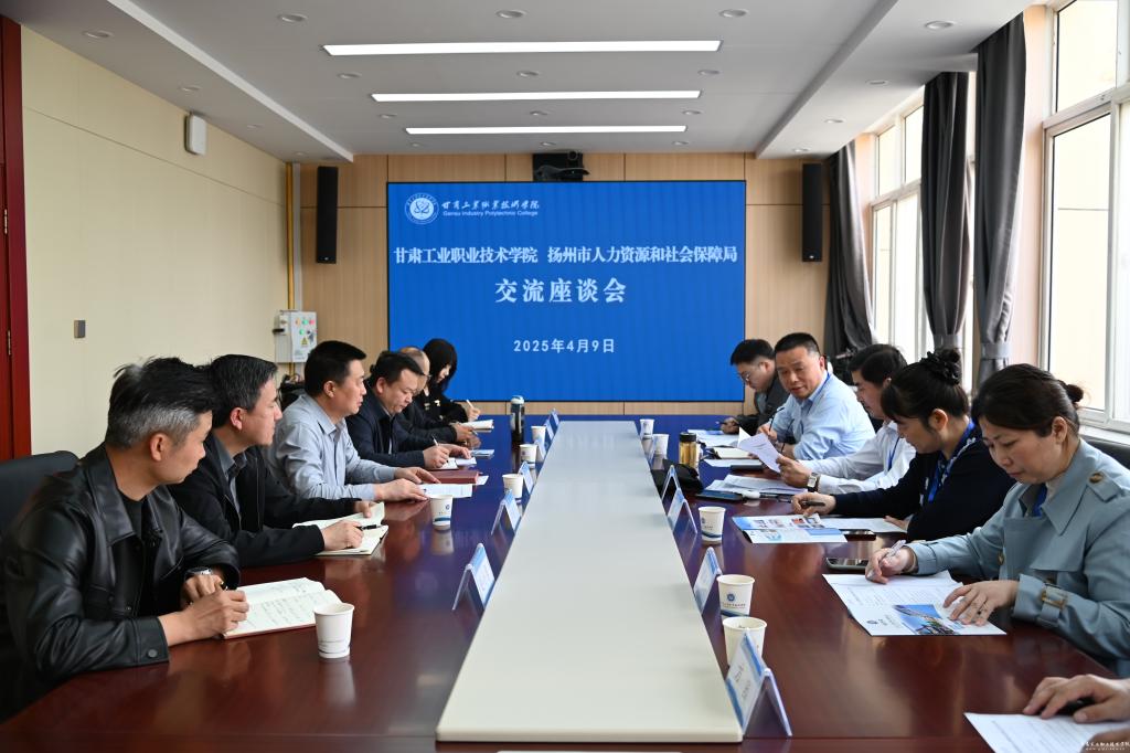座谈会上,贾昌麟对扬州市人力资源和社会保障局一行的到来表示热烈欢迎,并就学校的办学特色、专业设置、师资队伍、人才培养及就业情况等进行了介绍。徐才祥介绍了扬州当地的产业优势和人才政策,双方一致希望通过此次交流,建立长期稳定合作关系,进一步增进友谊、凝聚共识、探索路径,共创人才培育新格局。