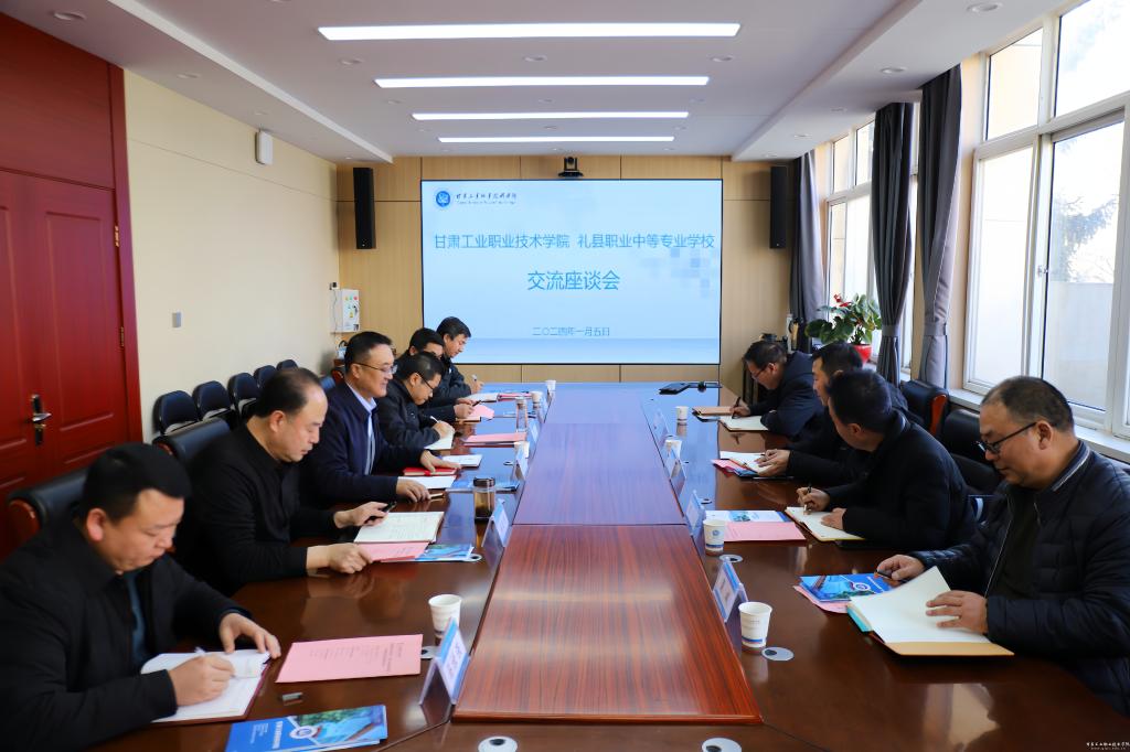 为进一步推进中高职贯通人才培养工作,1月5日下午,礼县职业中等专业学校党委书记杨泽育一行4人,来我校就中高职联合办学相关事宜开展座谈交流。校党委书记坚葆林,副院长王利军、周晓明出席,招生就业处、电信学院、旅游学院等相关负责人参加。