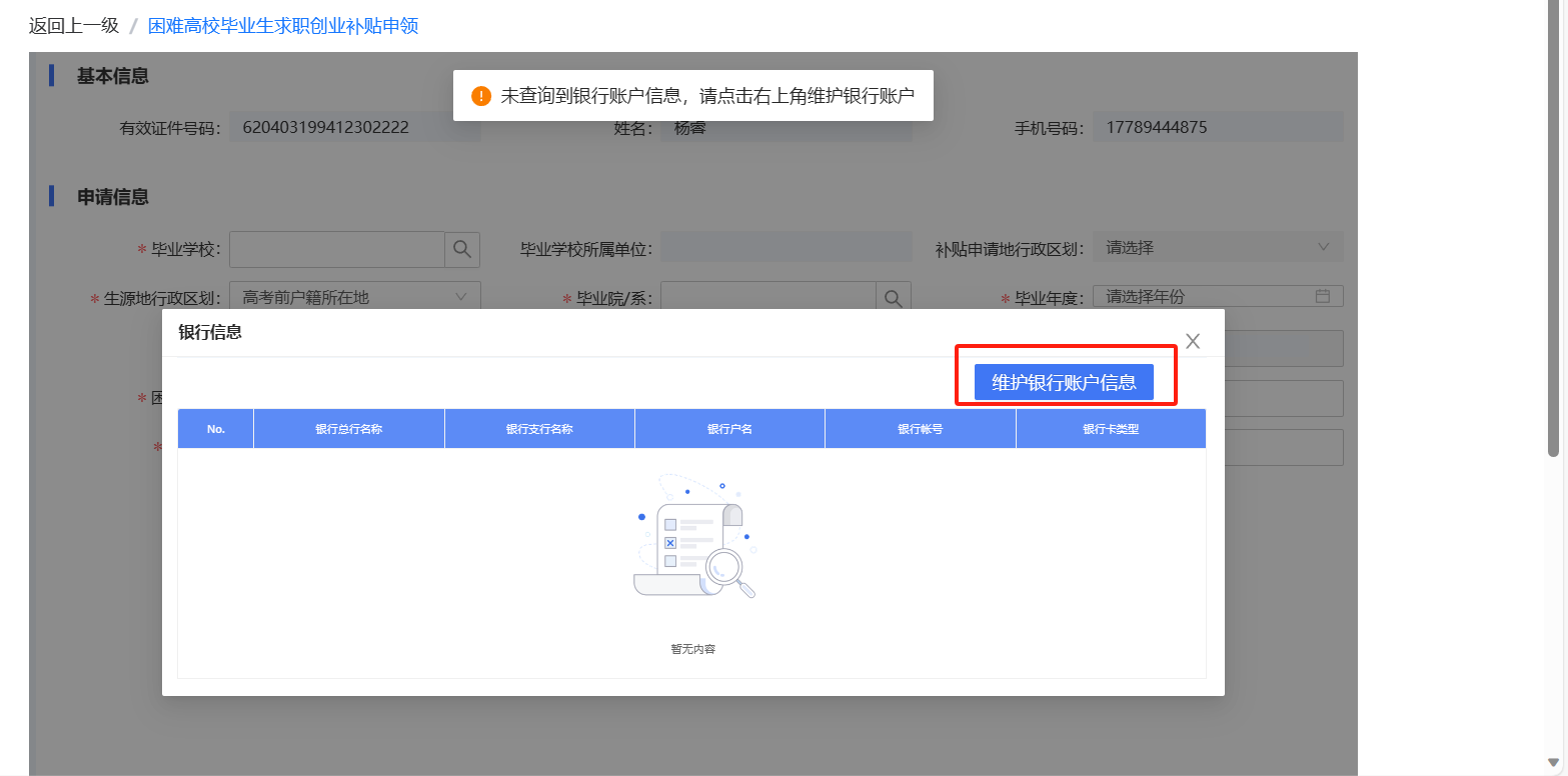 开户行输入信息后点击放大镜搜索,若没有查询到银行账户信息,点击页面上维护银行账户信息后,在弹出的对话框中,点击新增个人银行账户进行新增。