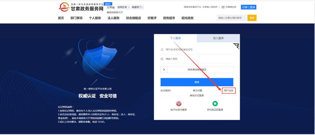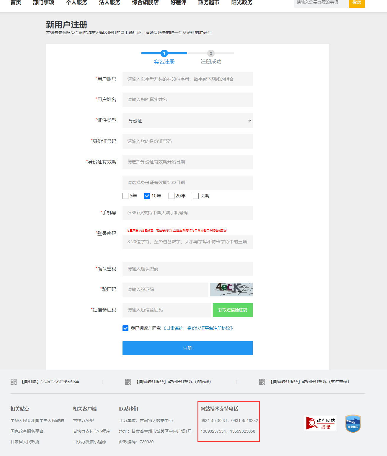 注:账号注册过程遇到问题请拨打甘肃政务服务网技术支持电话,技术支持电话可以在注册页面下方查找。