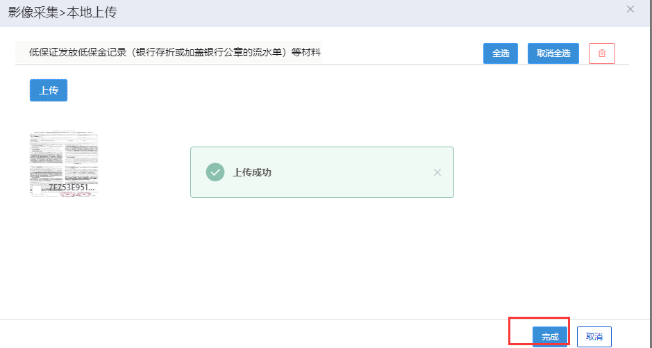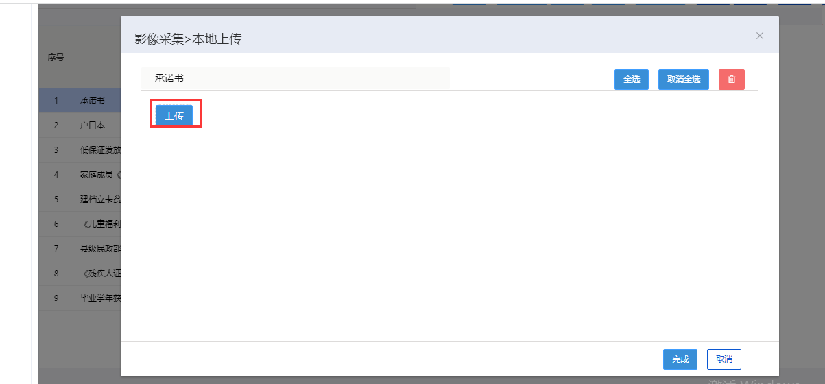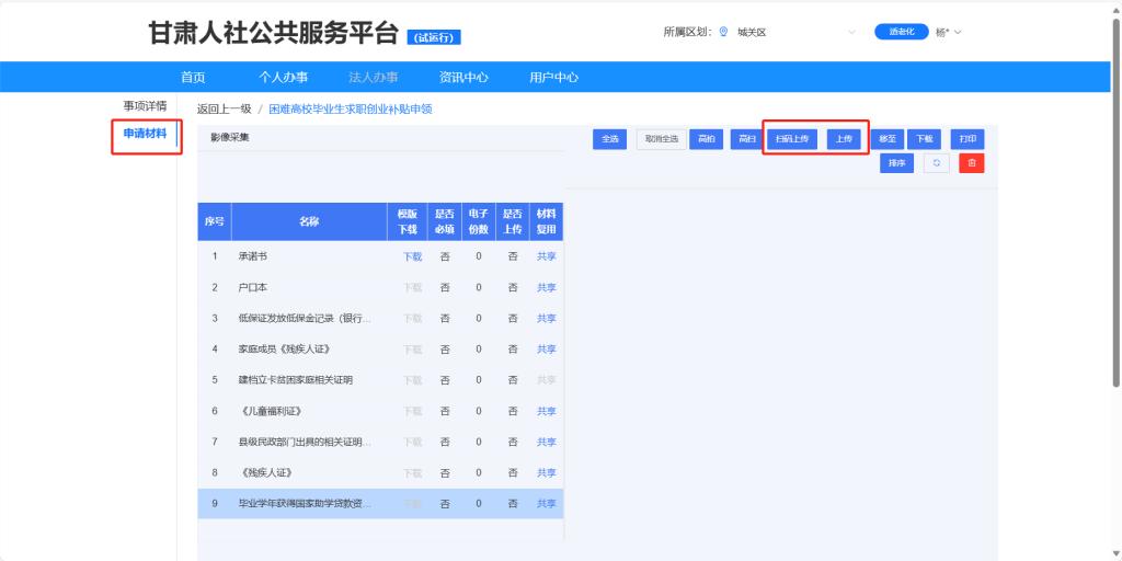 第七步:附件材料上传。点击【申请材料】,选中材料名称后,页面右上角会出现扫码上传或上传按钮,点击按钮可以上传材料。