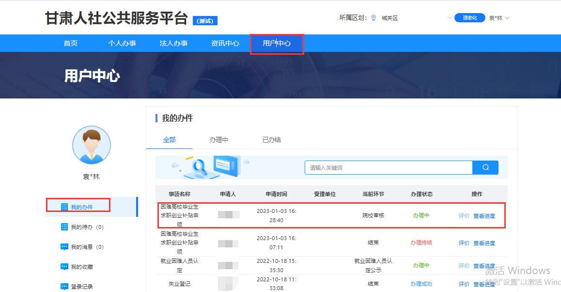 第九步:点击【用户中心-我的办件-查看进度】可以查看业务办理进度。