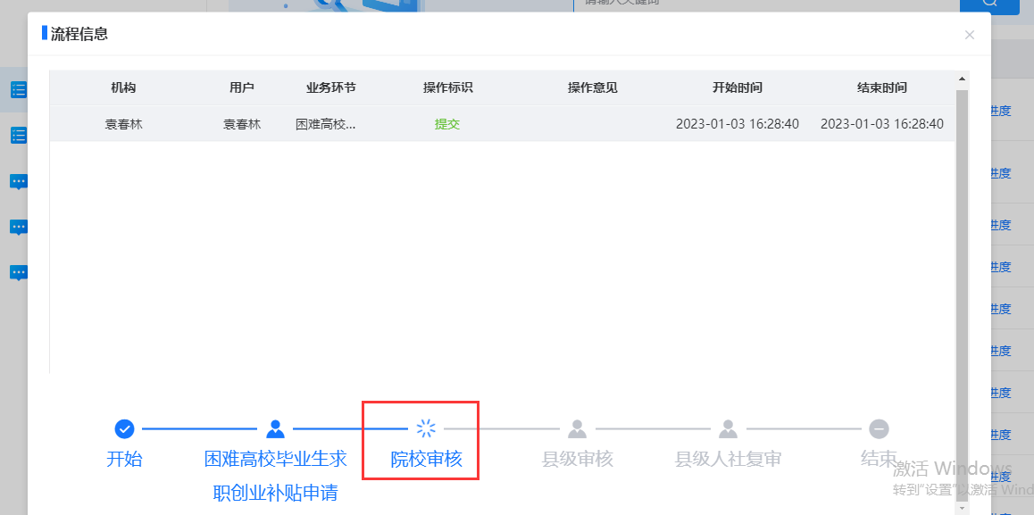 点击查看进度,可以查看事项在哪一级办理,鼠标移至环节处可以查看本环节的经办机构、经办日期等信息。