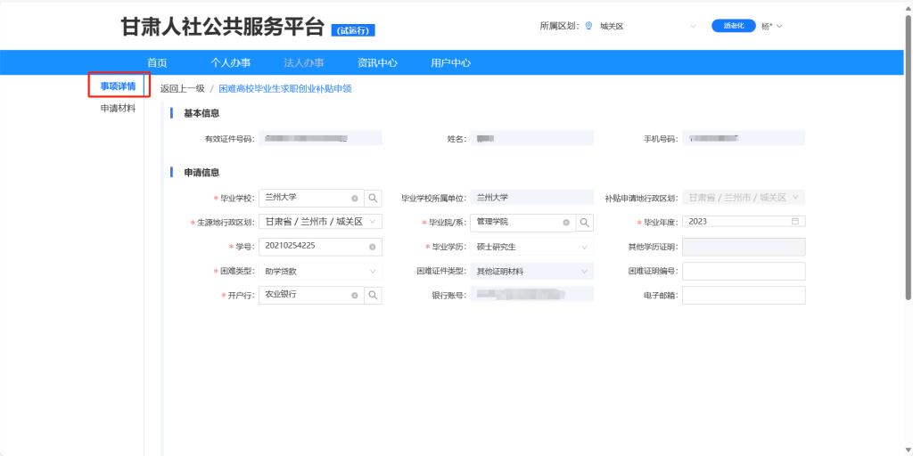 第八步:材料上传完成后点击事项详情回到申请页面,确认页面信息填写无误后点击【提交申请】。
