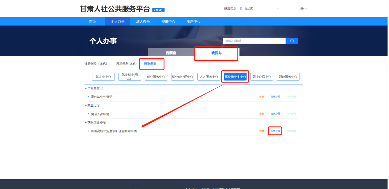 第五步:进入【个人办事】选择【我要办】,在【就业创业】下选择【高校毕业生中心】,点击【求职创业补贴】下的【困难高校毕业生求职创业补贴申领】右侧的【在线办理】。